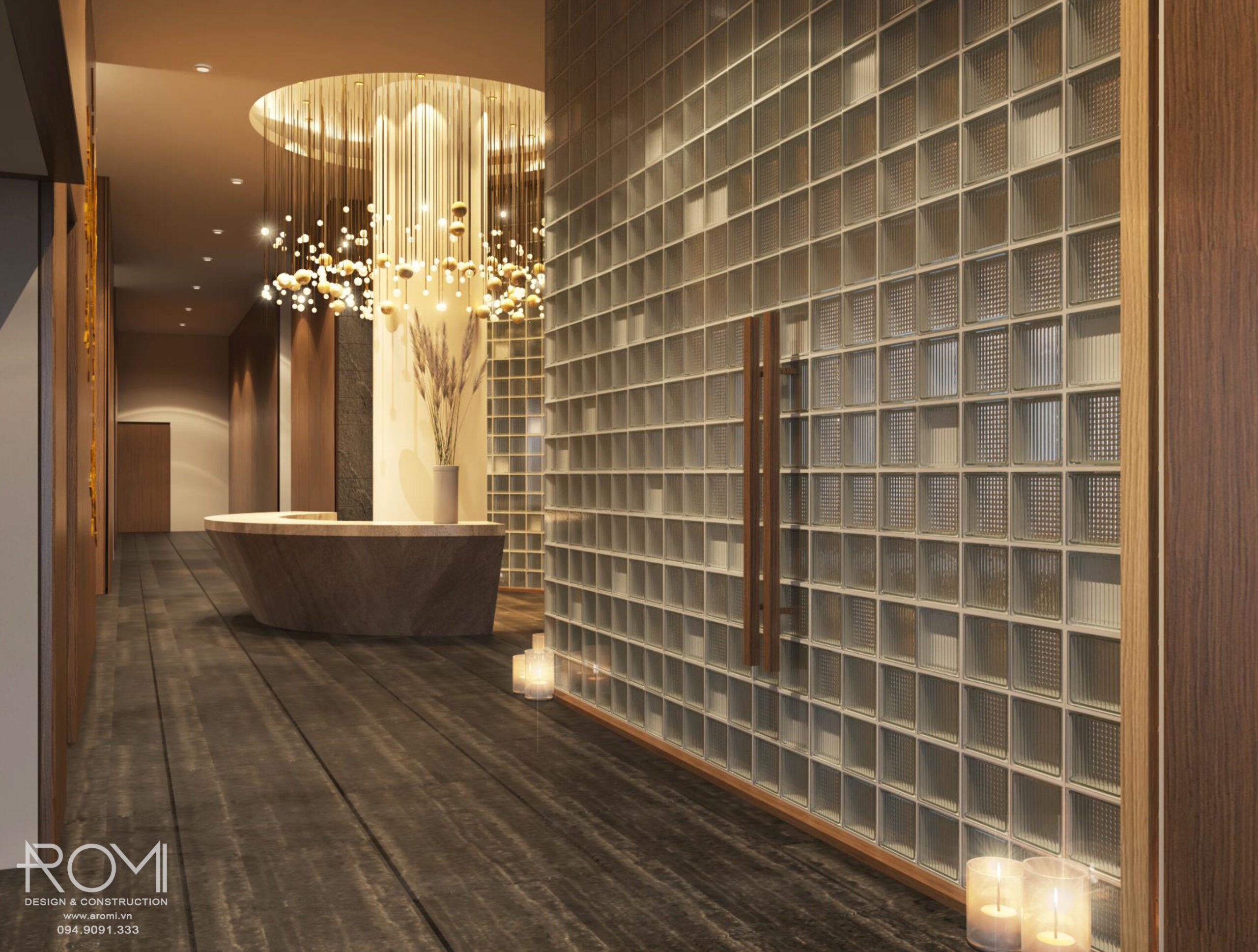 Sảnh Spa được thiết kế phá cách, gây ấn tượng với đèn chùm pha lê lớn tạo cảm giác sang trọng, cao cấp. Màu nâu chủ đạo càng giúp gây ấn tượng mạnh mẽ với khách hàng. Hệ vách ngăn hình vòng cung làm tăng thêm cảm giác mềm mại, thoải mái.