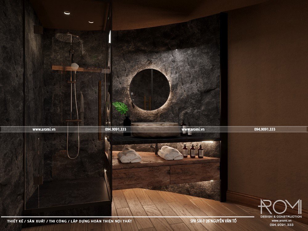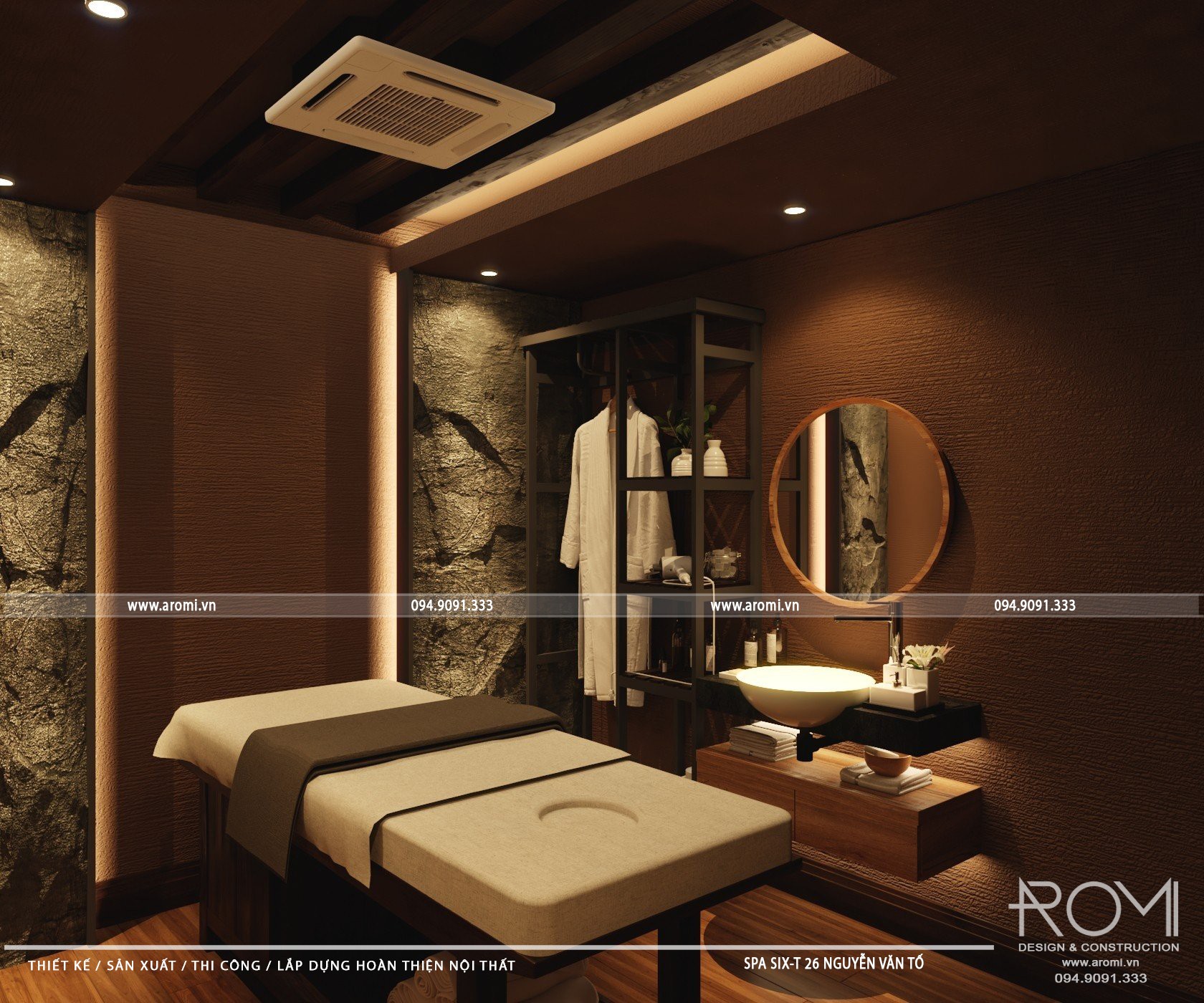 Tông màu nâu đất trầm ấm mà Aromi lựa chọn cho các căn phòng sẽ giúp các vị khách có những giây phút trị liệu thư thái và dễ chịu nhất. Bên cạnh đó, cách vách được làm từ tấm nhựa giả bê tông kết hợp với sơn hiệu ứng luôn được Aromi chú trọng và gửi gắm vào từng chi tiết, nhằm đem lại sự thanh khiết và tĩnh lặng cho không gian.