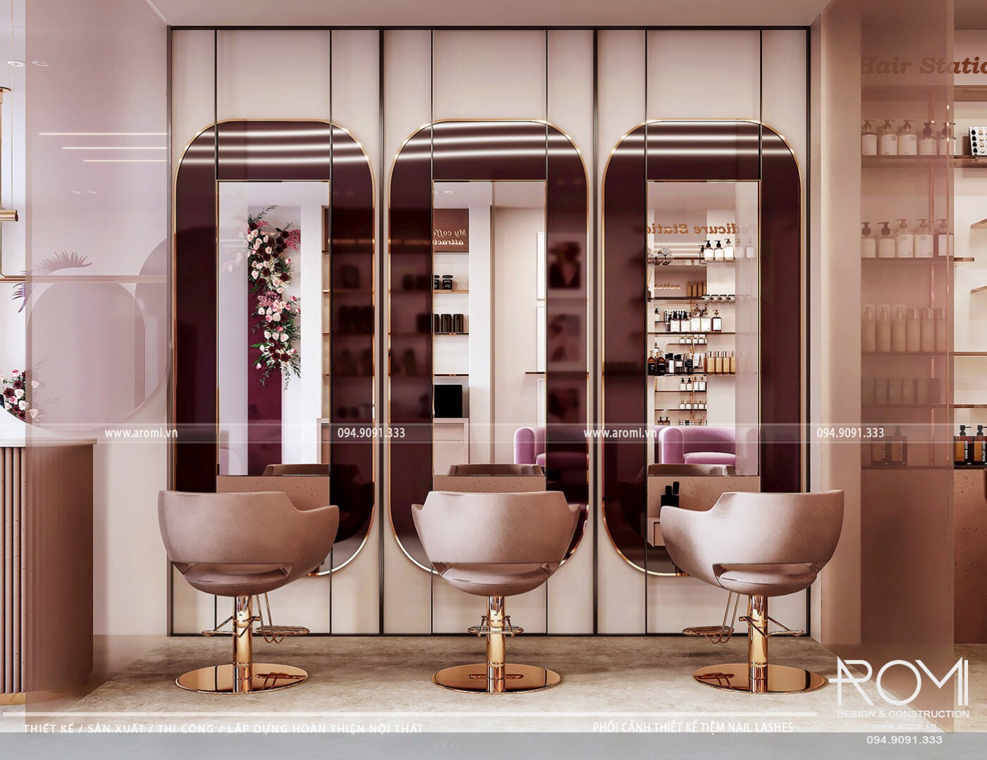 Không gian spa nail được thiết kế với phong cách Hàn Quốc hiện đại, sang trọng, sử dụng gam màu pastel nhẹ nhàng kết hợp với các chi tiết kim loại sáng bóng. Phong cách này không chỉ tạo cảm giác dịu mắt mà còn mang lại sự thanh lịch, sang trọng – điều mà Aromi luôn hướng đến trong các dự án của mình.